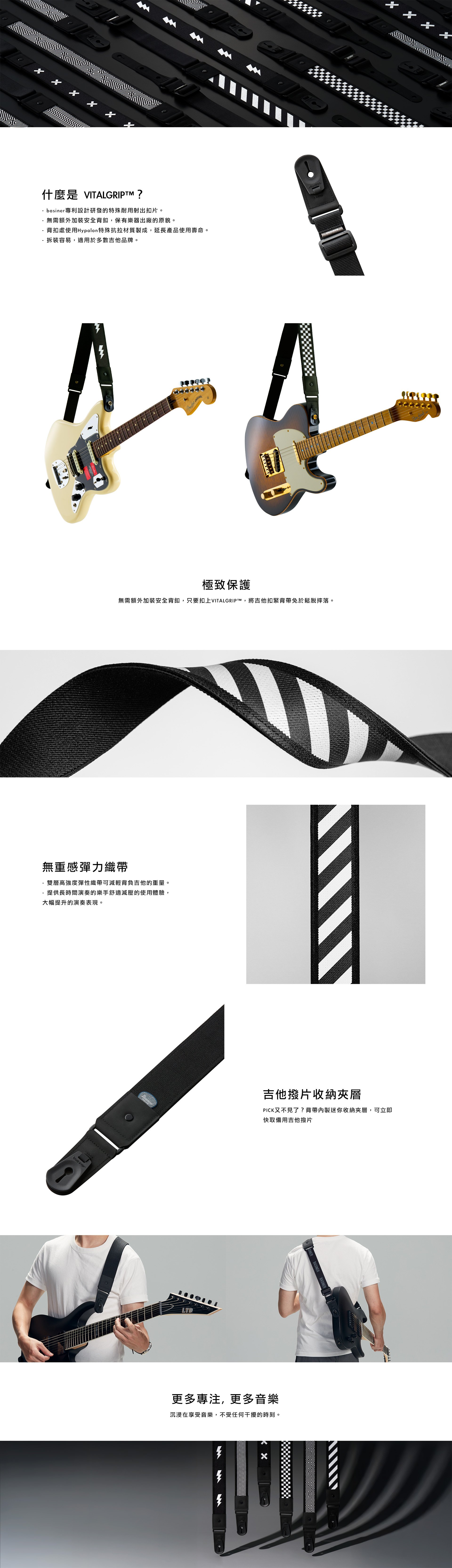 本款為DURA的HARDCORE系列,以工業風格外型,將硬核的精神、視覺感觀的衝擊,毫無保留的表達出來, 背帶使用與ACME 系列相同的 VITALGRIP™專利設計扣片,在無需額外加裝安全背釦及任何改動下,可將吉他牢牢抓緊。 此外, 背帶選用無重感彈力織帶,以雙層高強度彈性織帶製成,可減輕背負吉他的重量,即便是長時間演奏,也不感覺到疲倦,大幅提升演奏時的續航力。